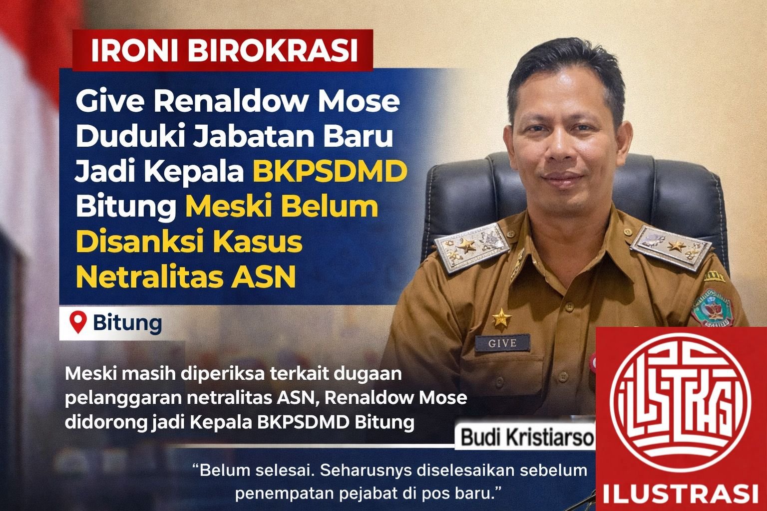 Ilustrasi.click, Bitung — Penempatan Give Renaldow Mose sebagai Kepala Badan Kepegawaian dan Pengembangan Sumber Daya Manusia Daerah (BKPSDMD) Kota Bitung menuai sorotan tajam. Pasalnya, yang bersangkutan diketahui masih dalam proses penanganan dugaan pelanggaran kode etik dan netralitas Aparatur Sipil Negara (ASN), namun justru telah dipercaya menduduki posisi strategis di lingkup pemerintahan Kota Bitung. Selasa, (14/04/2026)